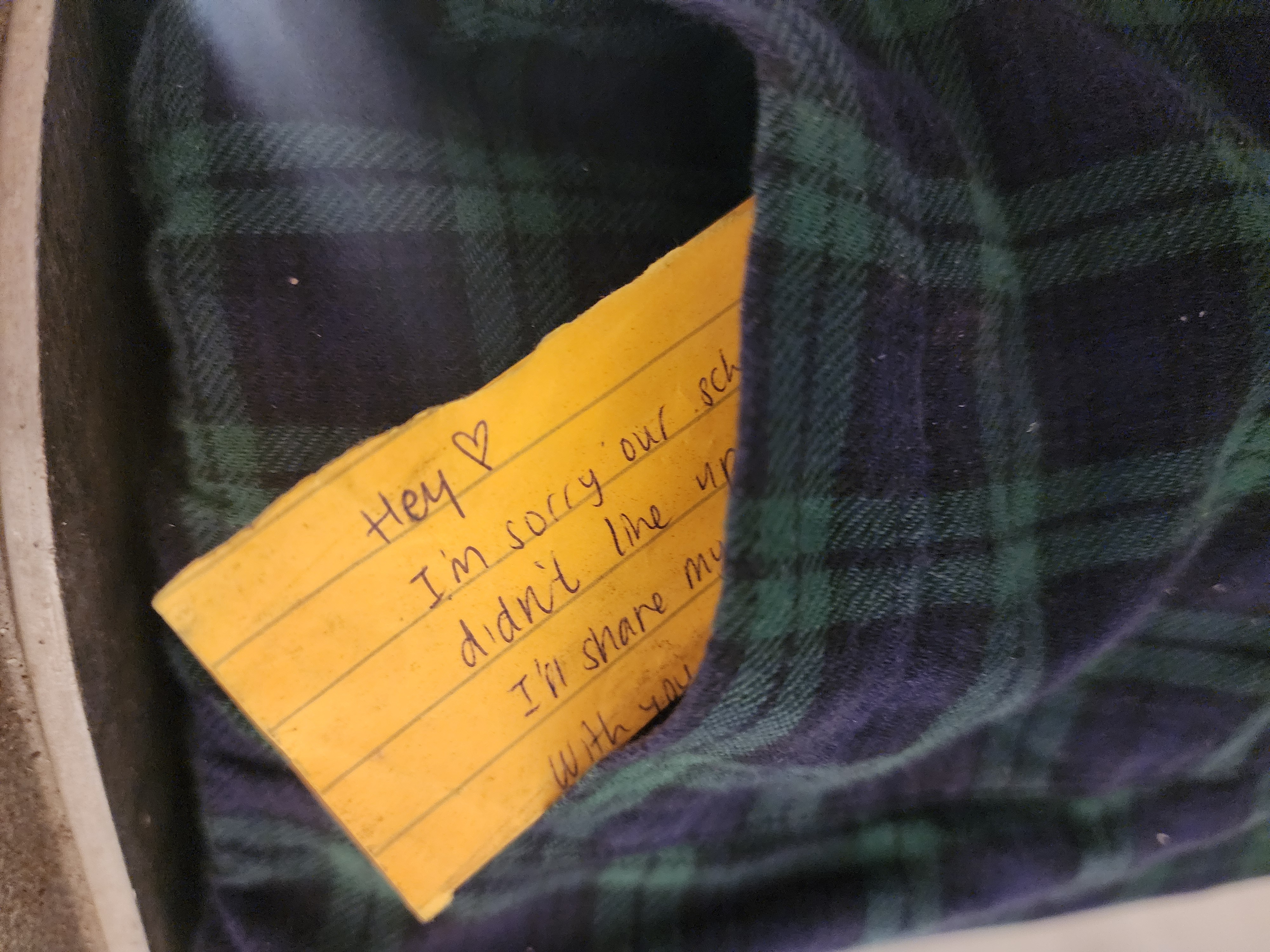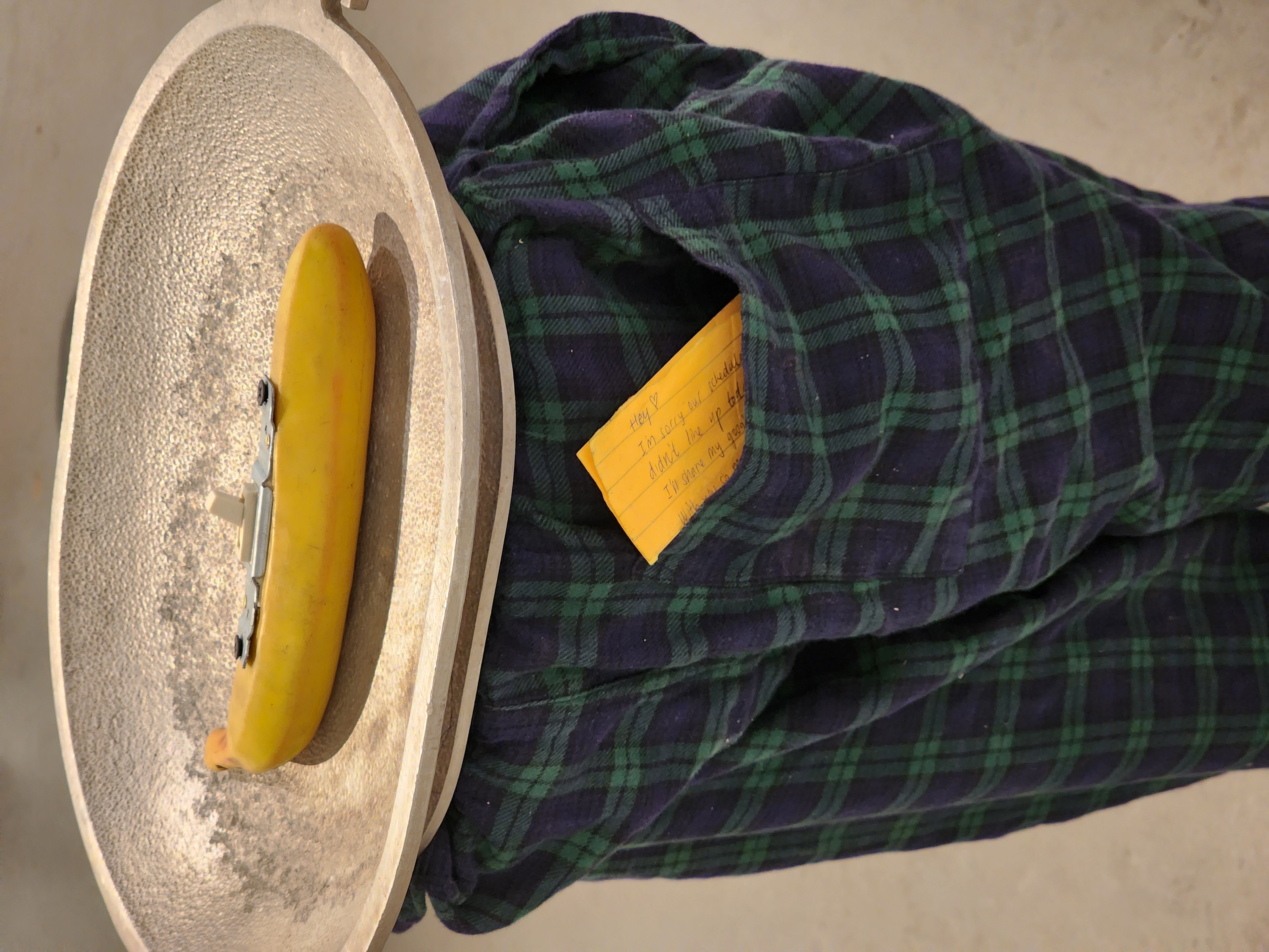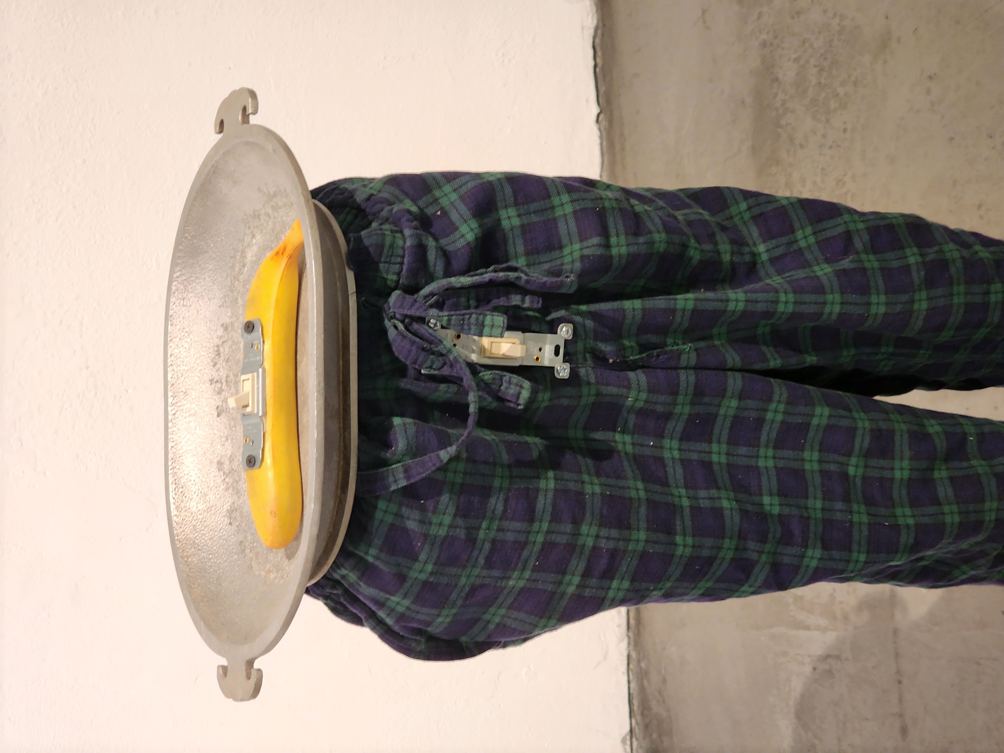 plastic banana, metal plate, flannel pajama pants, light switches, found note