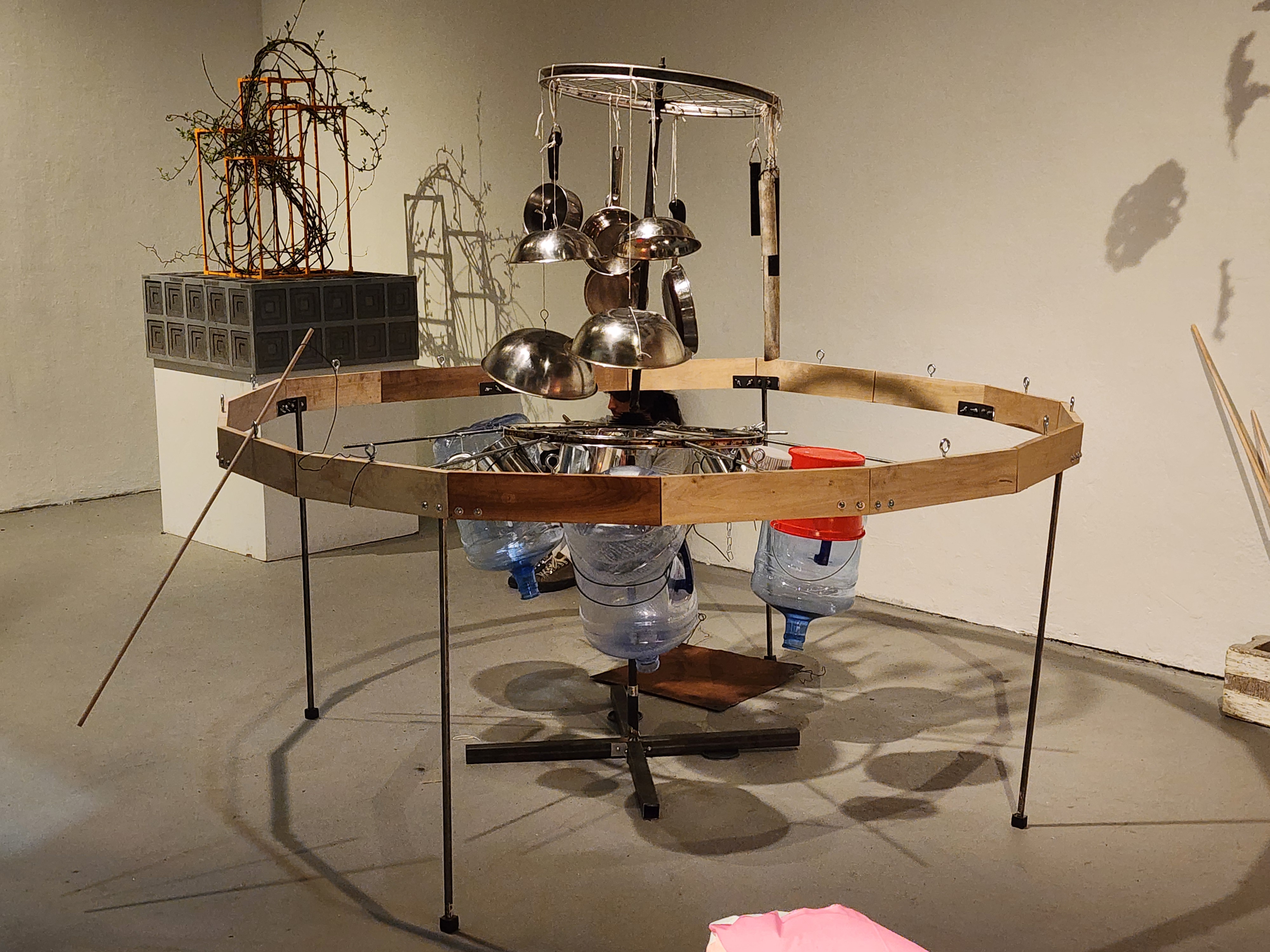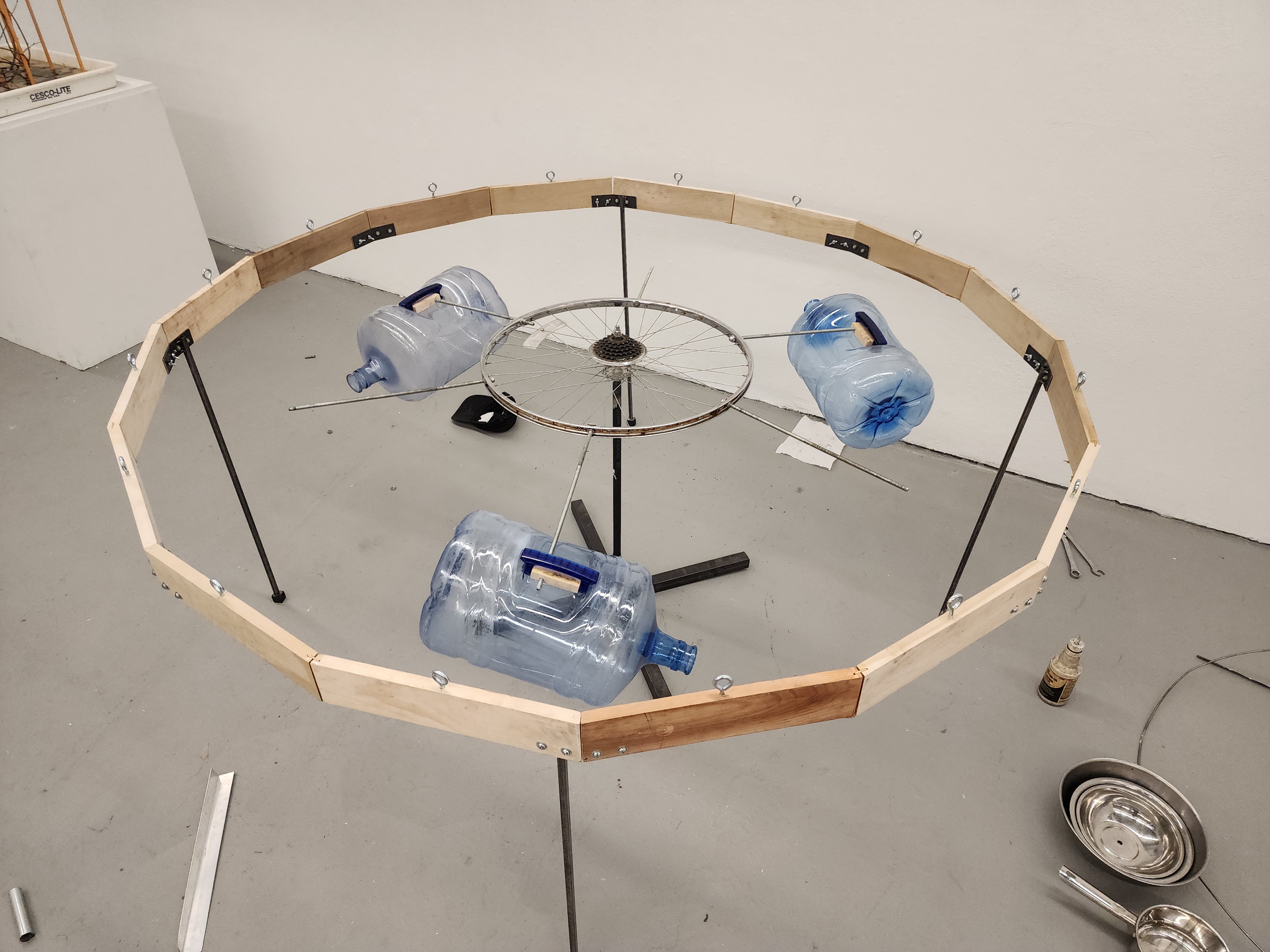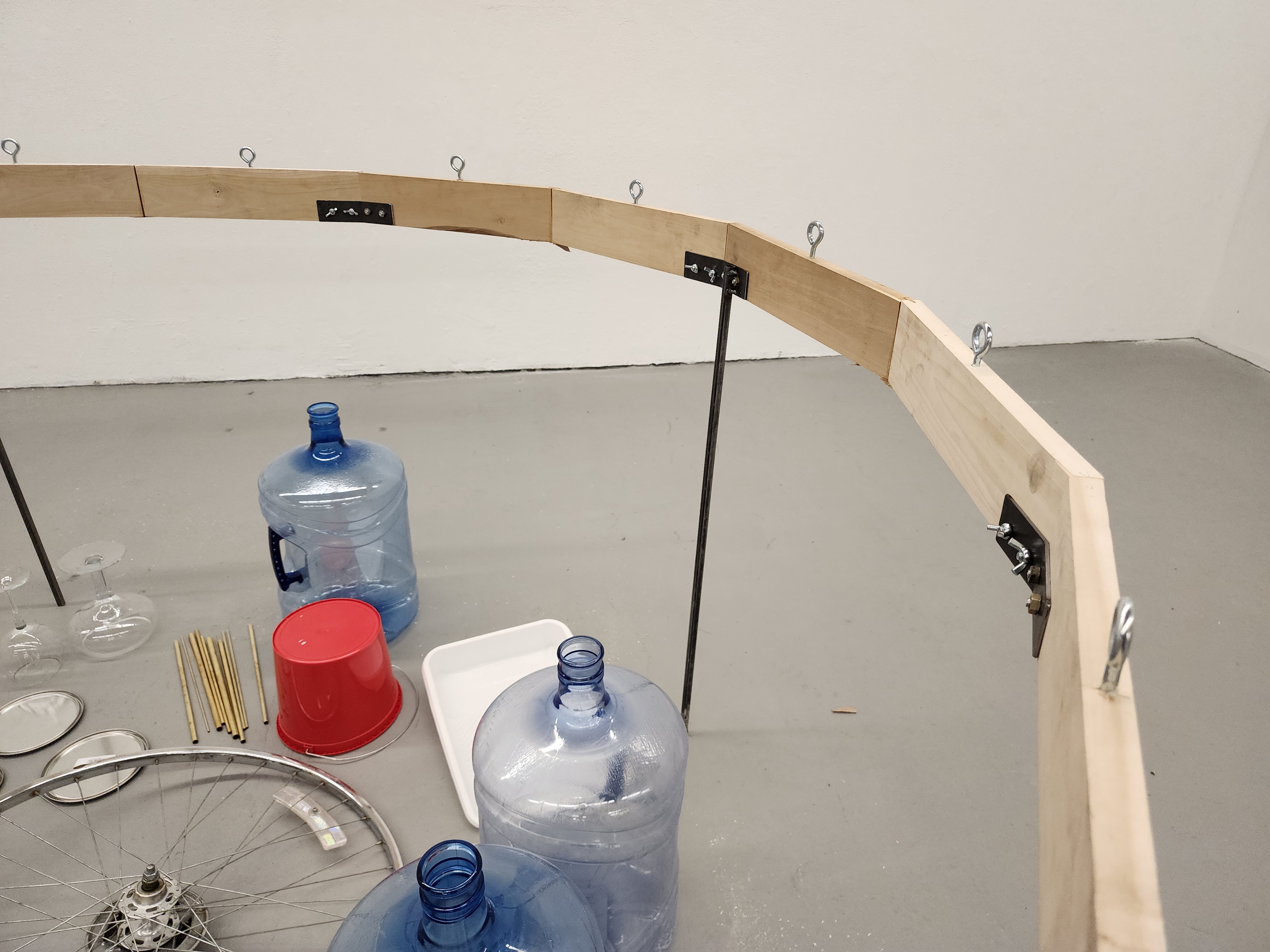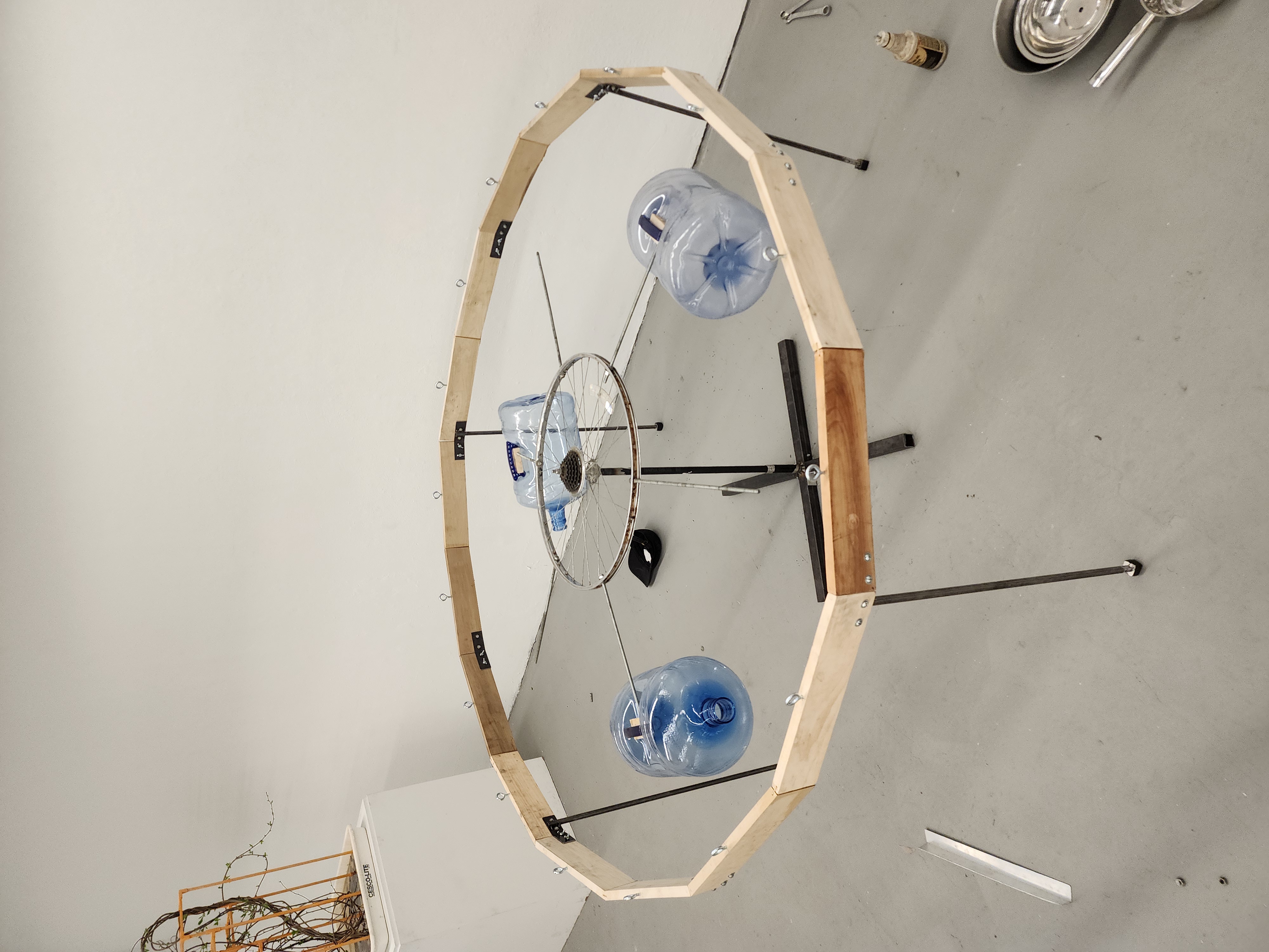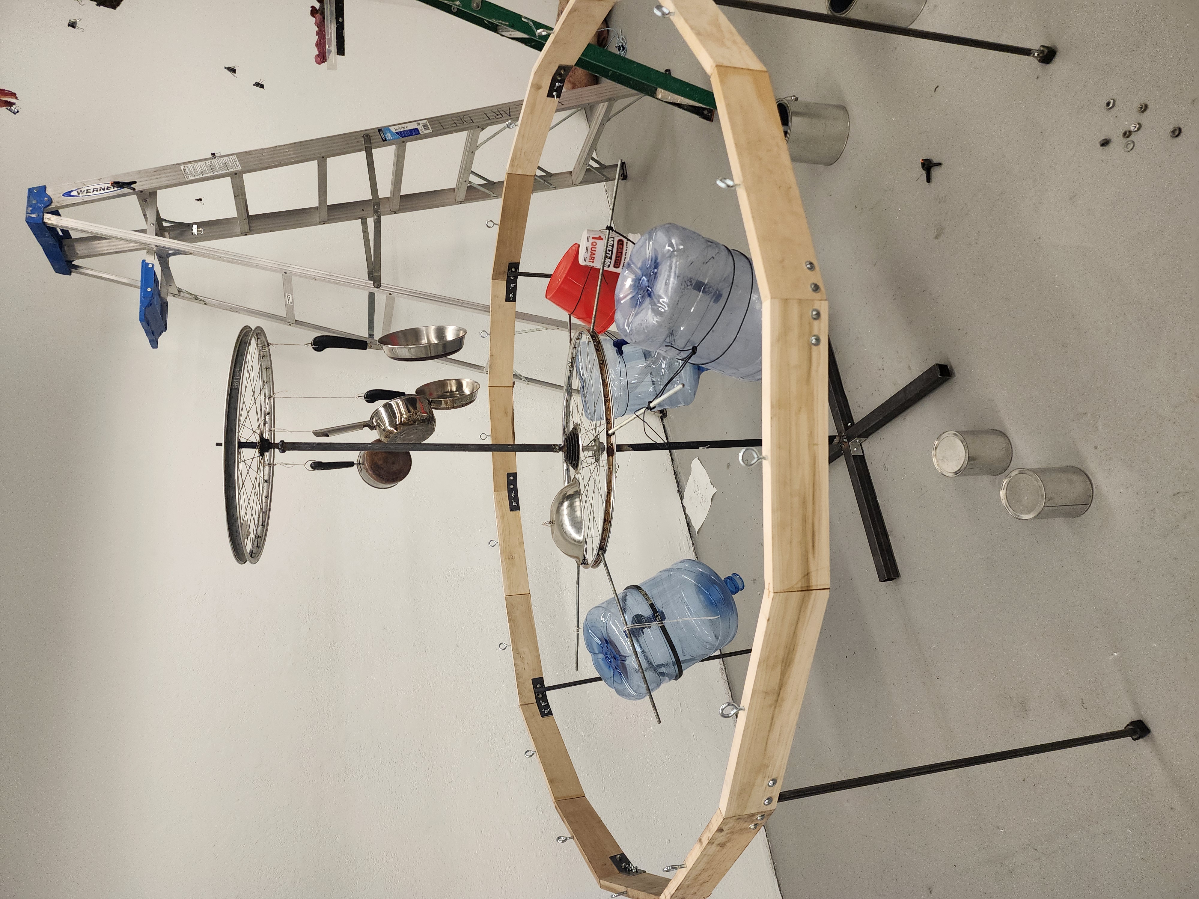 wood, metal, bicycle wheels, steel pipes, aluminum bowls, pans, plastic jugs, metal and plastic buckets, sheet metal, miscellaneous hardware