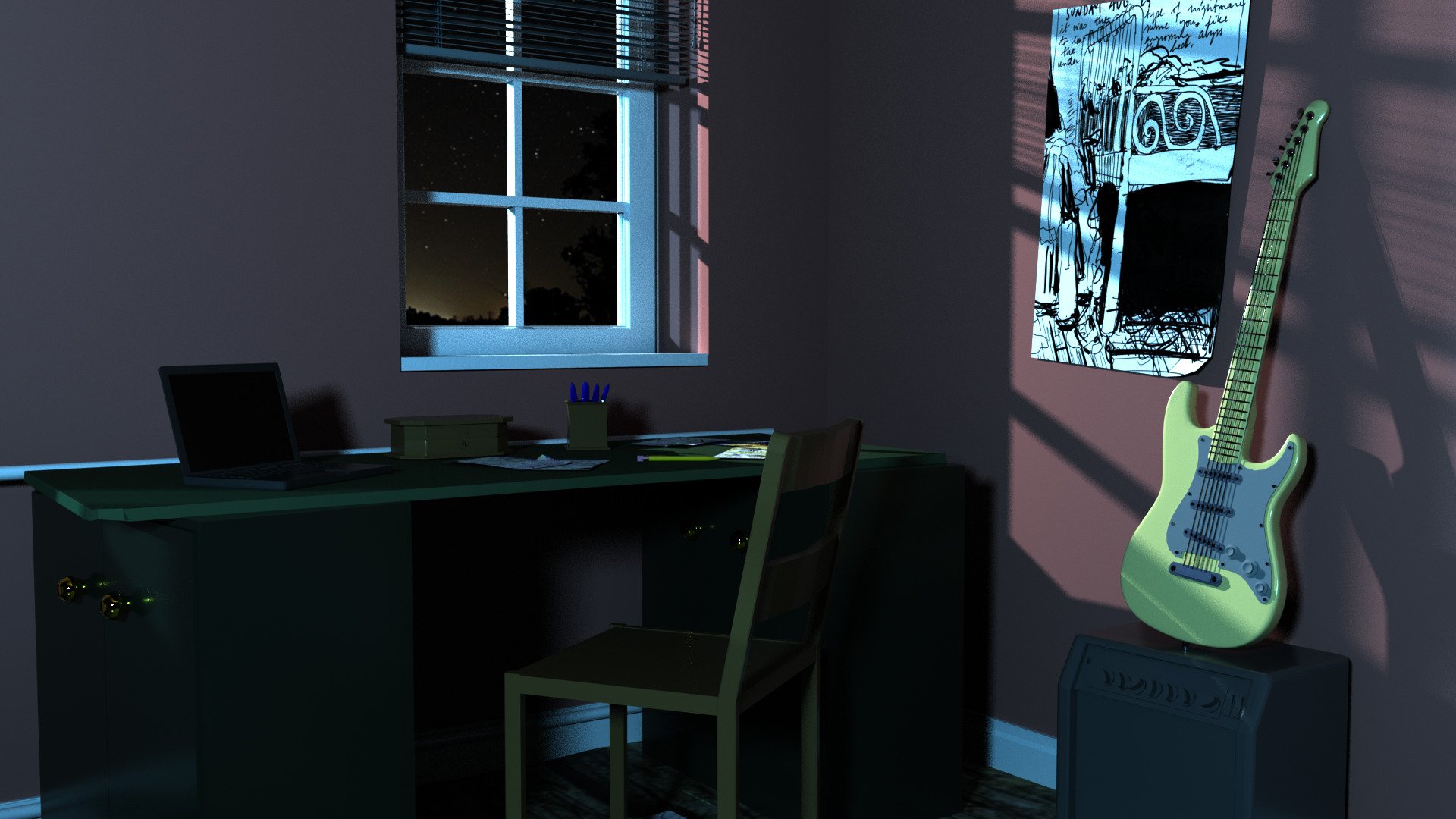 I arranged, shaded and lit this bedroom scene for my Intro to 3D Animation class.