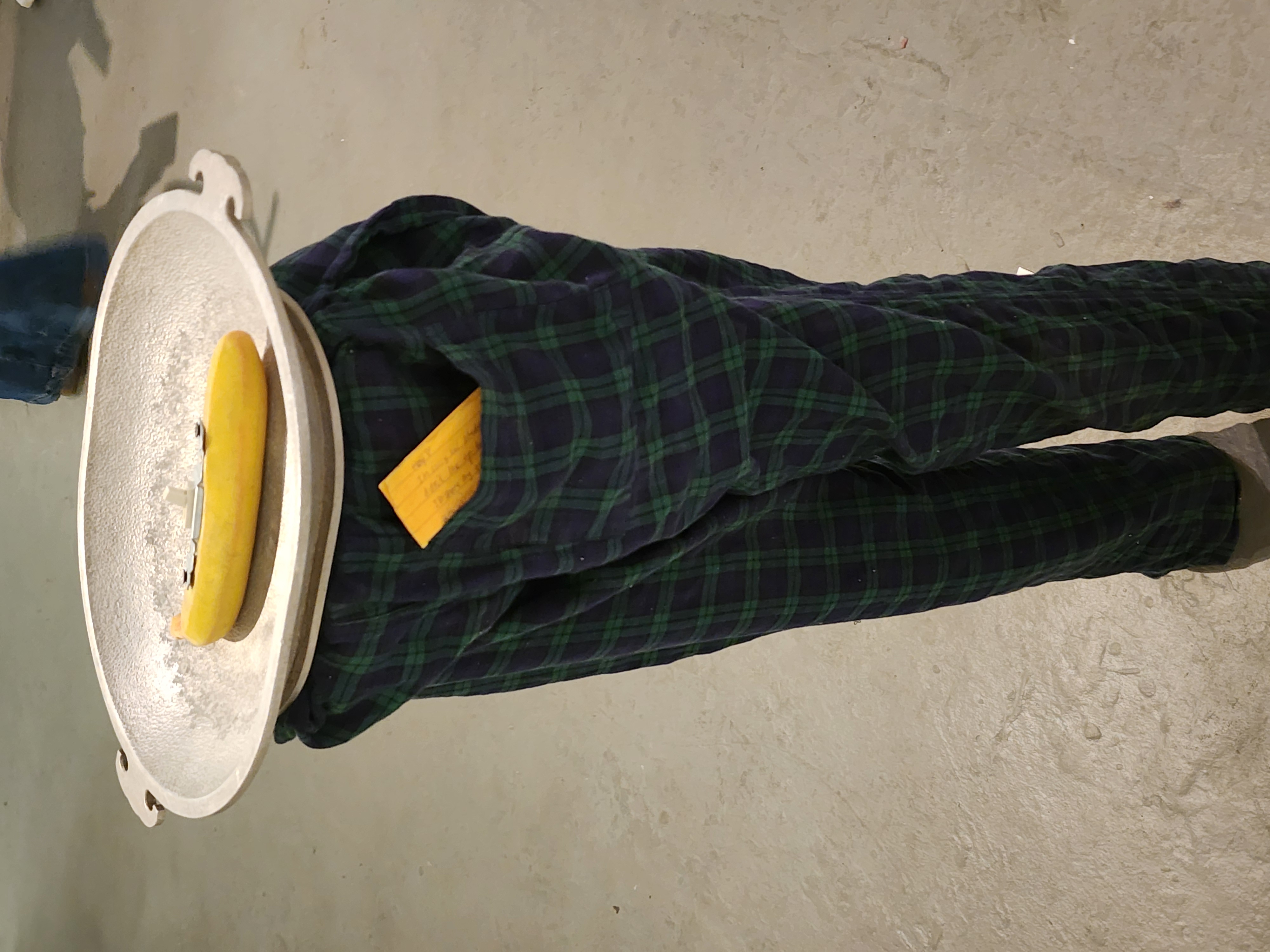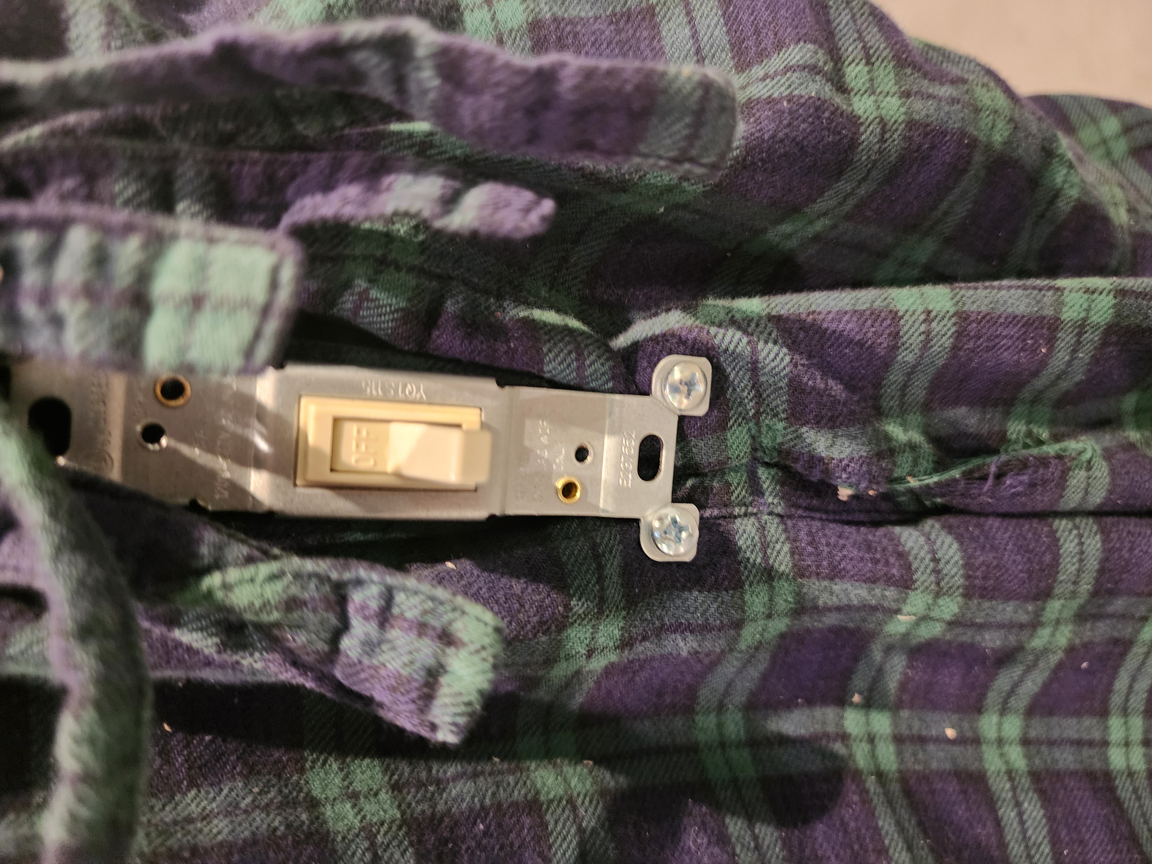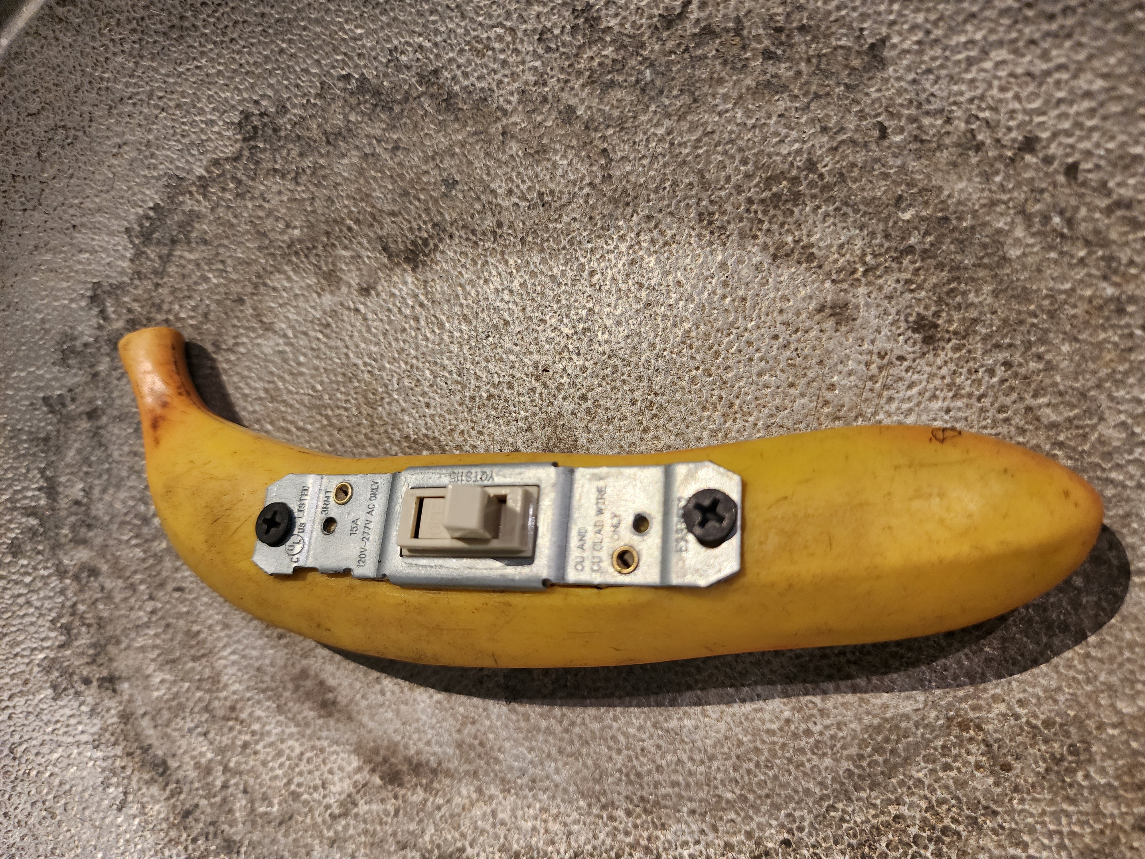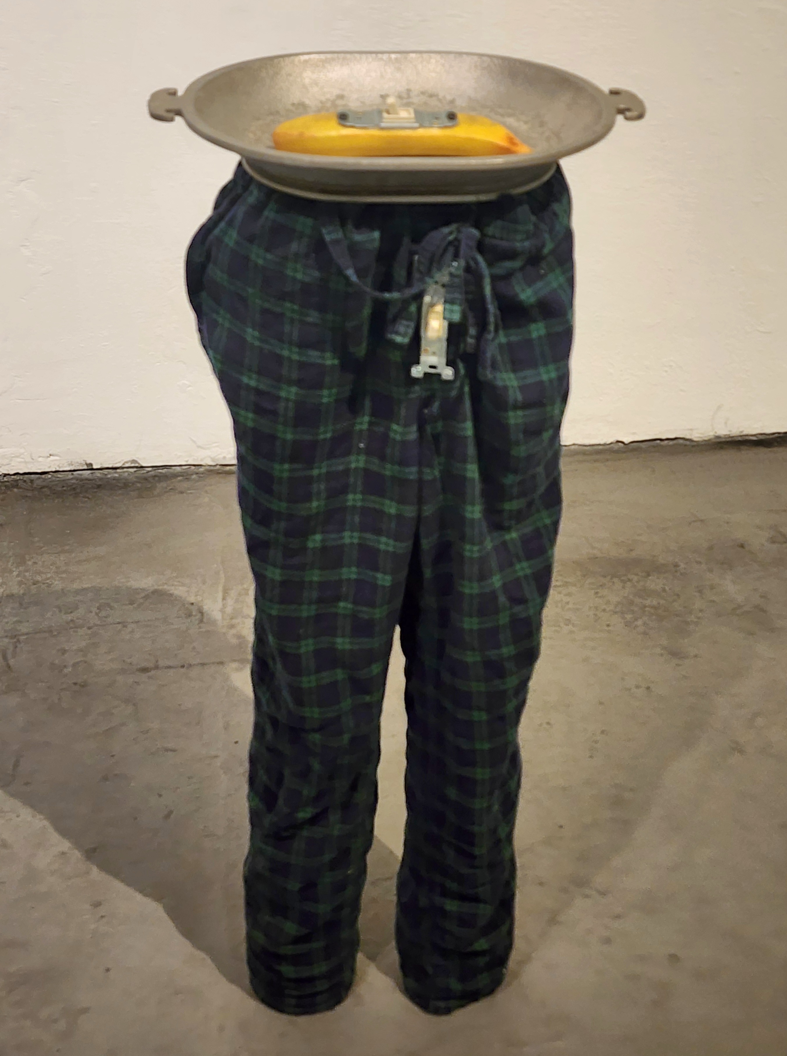 plastic banana, metal plate, flannel pajama pants, light switches, found note